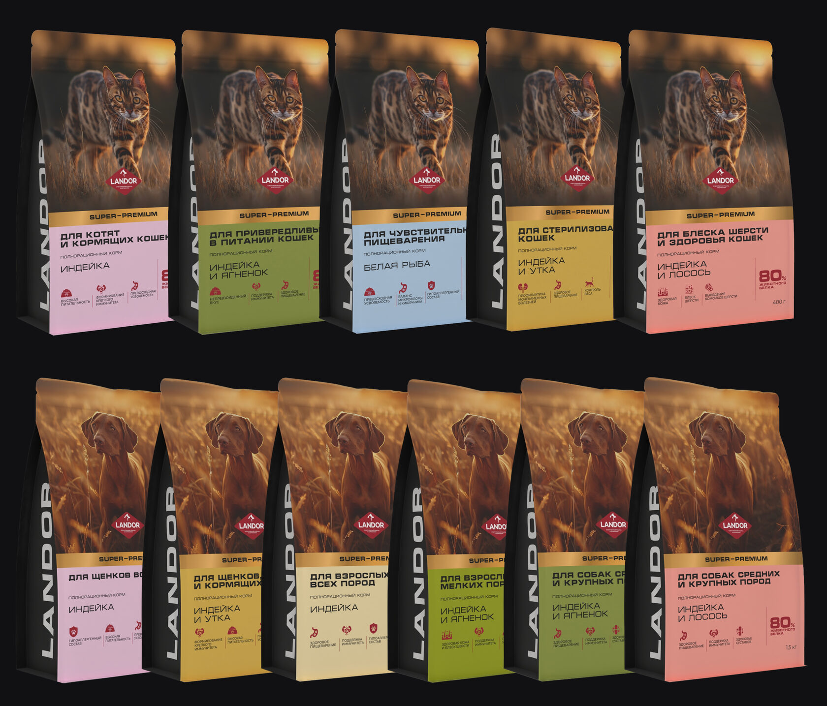 Рецептуры Landor разрабатываются на основе собственных ветеринарных исследований — чтобы пробуждать естественный аппетит, а не заменять его добавками.